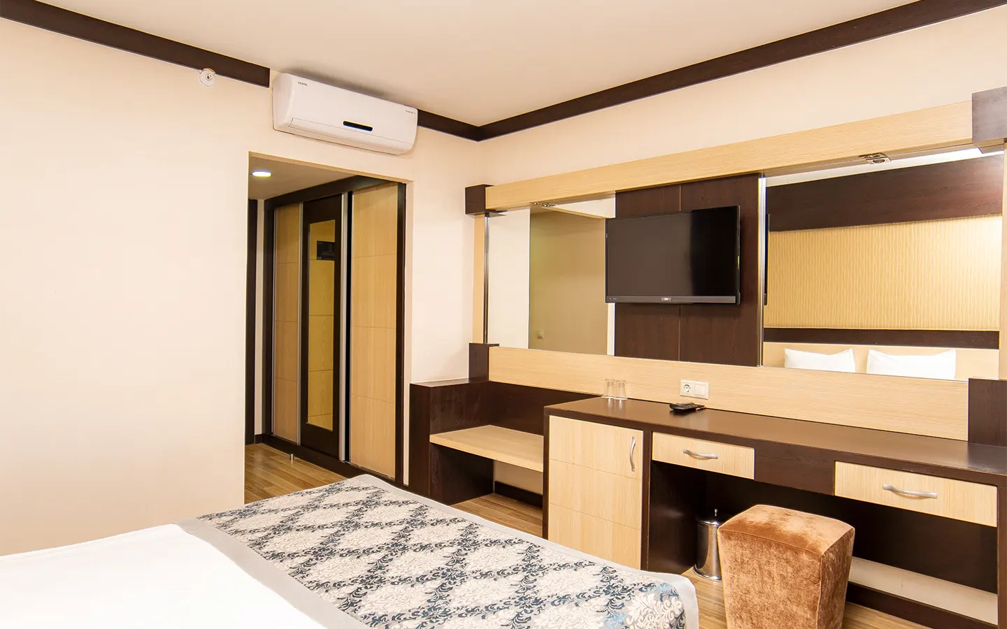 Pool View Room is about 20-25 m². The bed capacity is the same as the standard room. Soft drinks are placed in the minibar on the day of check-in and 2 bottles of 1.5 liters of water are provided daily on the other days. On the first day there is a fruit plate and wine.